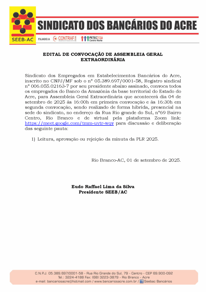 Sindicato dos Empregados em Estabelecimentos Bancários do Acre, inscrito no CNPJ/MF sob o nº 05.389.697/0001-58, Registro sindical nº 006.055.02163-7 por seu presidente abaixo assinado, convoca todos os empregados do Banco da Amazônia da base territorial do Estado do Acre, para Assembleia Geral Extraordinária que acontecerá dia 04 de setembro de 2025 ás 16:00h em primeira convocação e às 16:30h em segunda convocação, sendo realizado de forma hibrida, presencial na sede do sindicato, no endereço da Rua Rio grande do Sul, nº69 Bairro Centro, Rio Branco e de virtual pela plataforma Zoom link: https://meet.google.com/tmm-uytr-wqv para discussão e deliberação das seguinte pauta: