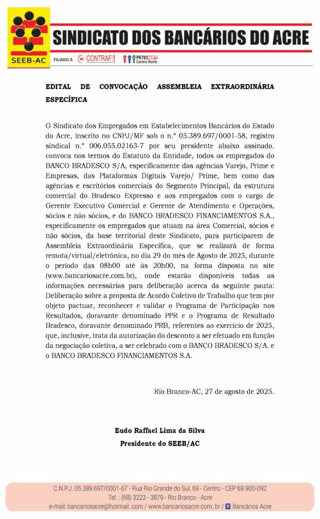O Sindicato dos Empregados em Estabelecimentos Bancários do Estado do Acre, inscrito no CNPJ/MF sob o n.º 05.389.697/0001-58, registro sindical n.º 006.055.02163-7 por seu presidente abaixo assinado. convoca nos termos do Estatuto da Entidade, todos os empregados do BANCO BRADESCO S/A, especificamente das agências Varejo, Prime e Empresas, das Plataformas Digitais Varejo/ Prime, bem como das agências e escritórios comerciais do Segmento Principal, da estrutura comercial do Bradesco Expresso e aos empregados com o cargo de Gerente Executivo Comercial e Gerente de Atendimento e Operações, sócios e não sócios, e do BANCO BRADESCO FINANCIAMENTOS S.A., especificamente os empregados que atuam na área Comercial, sócios e não sócios, da base territorial deste Sindicato, para participarem de Assembleia Extraordinária Específica, que se realizará de forma remota/virtual/eletrônica, no dia 29 do mês de Agosto de 2025, durante o período das 08h00 até às 20h00, na forma disposta no site (www.bancariosacre.com.br), onde estarão disponíveis todas as informações necessárias para deliberação acerca da seguinte pauta: Deliberação sobre a proposta de Acordo Coletivo de Trabalho que tem por objeto pactuar, reconhecer e validar o Programa de Participação nos Resultados, doravante denominado PPR e o Programa de Resultado Bradesco, doravante denominado PRB, referentes ao exercício de 2025, que, inclusive, trata da autorização do desconto a ser efetuado em função da negociação coletiva, a ser celebrado com o BANCO BRADESCO S/A. e o BANCO BRADESCO FINANCIAMENTOS S.A.